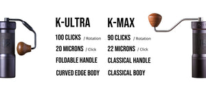 - Elegantní a pohodlný design: Díky zaoblenému tělu a zakřiveným hranám nabízí K-Ultra pohodlný úchop a hladký zážitek z mletí. Perfektní jak pro kávové nadšence, tak profesionální baristy.