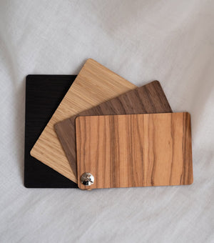 Vzorky jsou tenké, ošetřené stejným přírodním olejem, který používáme v našich hotových produktech, a spojeny praktickým kovovým šroubem.