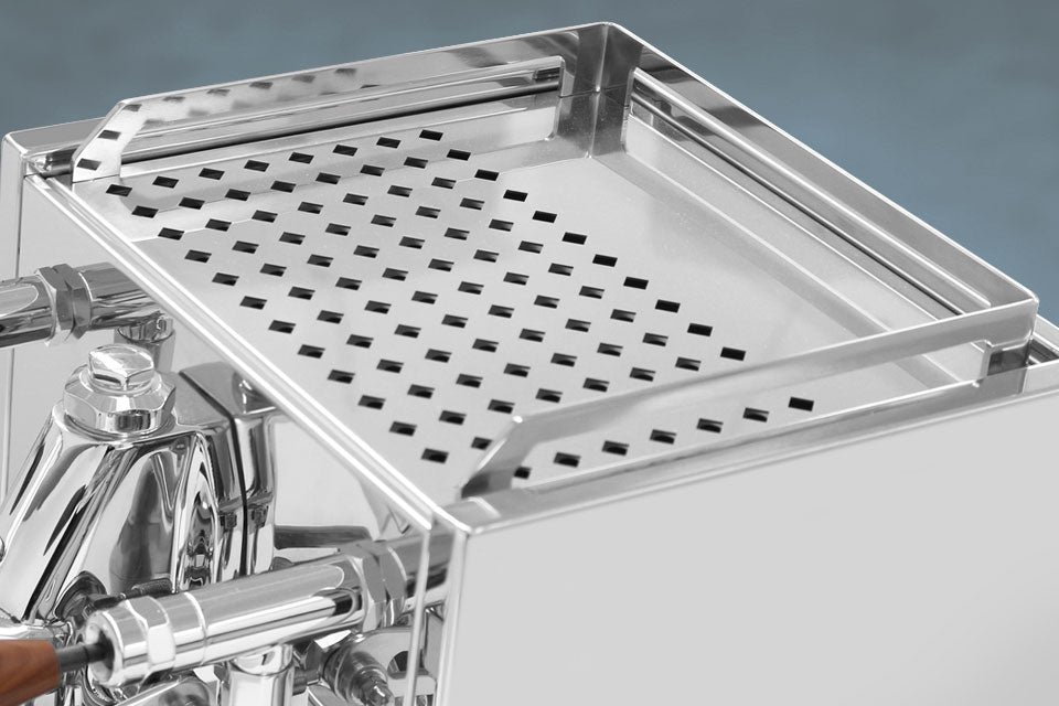 Rám z nerezové oceli, leštěné hliníkové nožičky, velký ohřívač šálků a praktická odkapávací miska.
