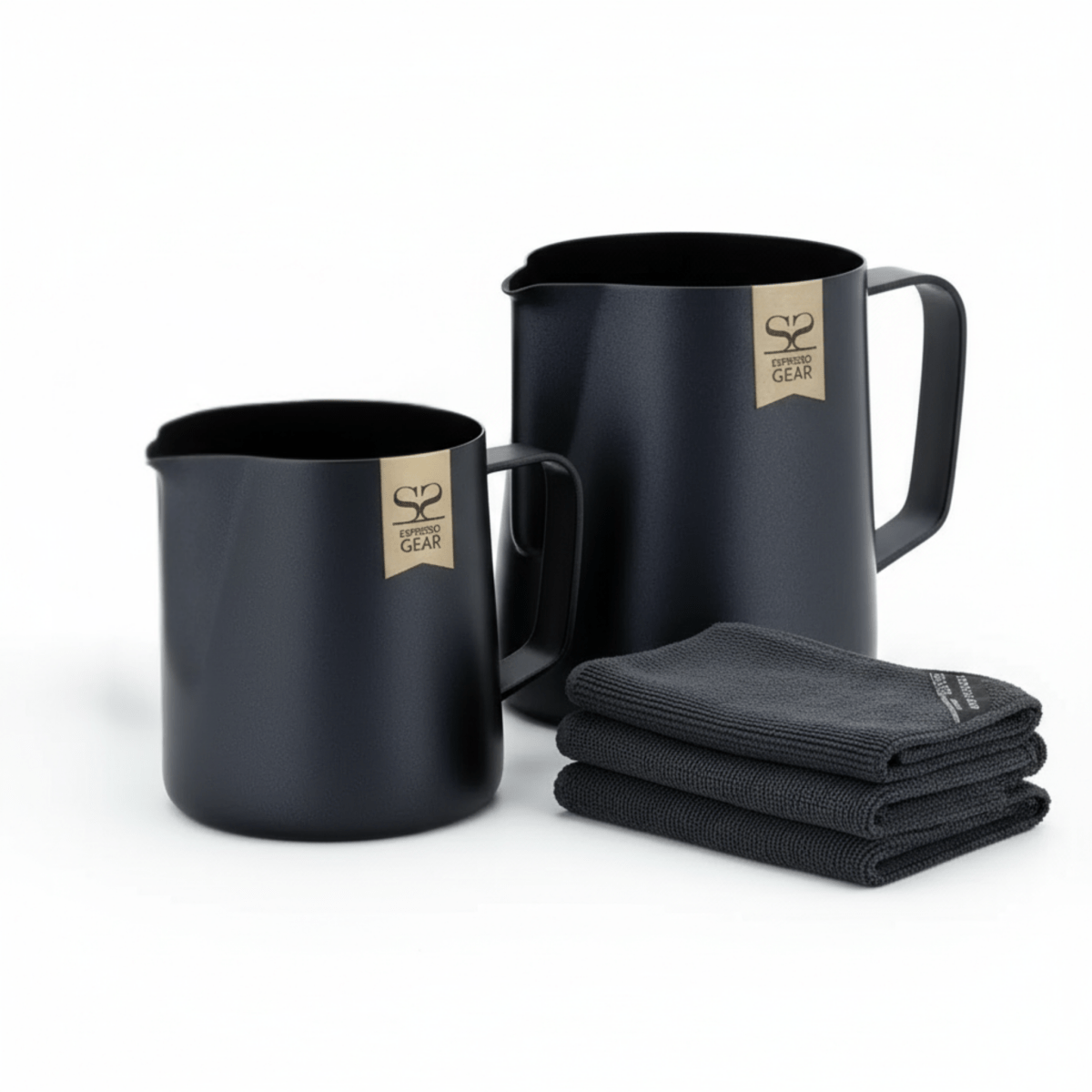 Espresso Gear je renomovaná značka v oblasti barista vybavení. Matně černá nerezová ocel vysoké kvality a prémiové mikrovláknové utěrky, které vydrží každodenní používání. Stejné nástroje, jaké používají profesionálové, nyní ve vaší kuchyni.
