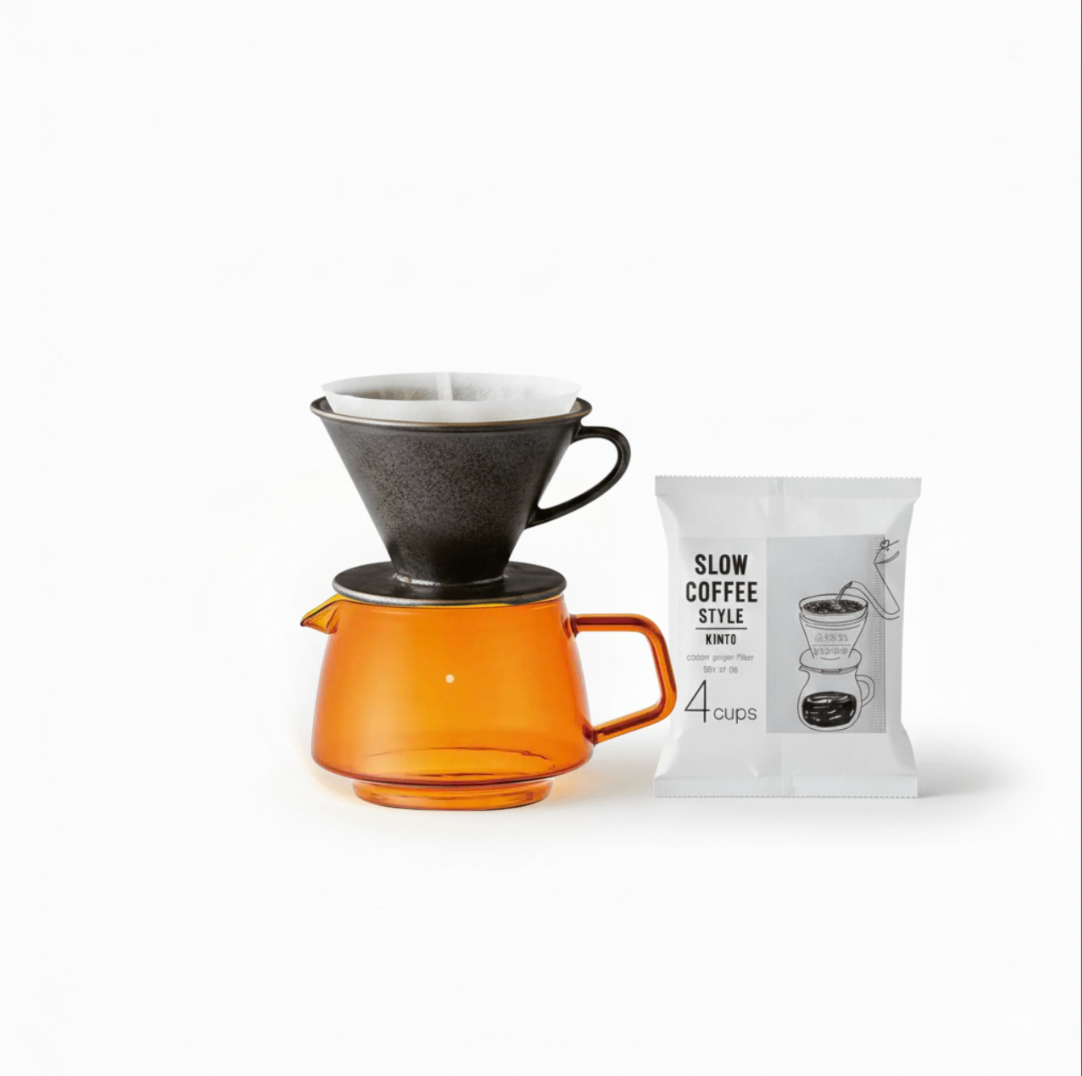 Kinto Slow style kávovar pro čtyři šálky. Balíček obsahuje 600 ml Kinto Sepia skleněnou konvici, keramický slow style scs-s01 filtr určený pro 4 šálky a 60 kusů filtrů. Skvěle se hodí pro ty, kteří hledají jednoduchou sadu na ruční přípravu kávy připravenou k použití!