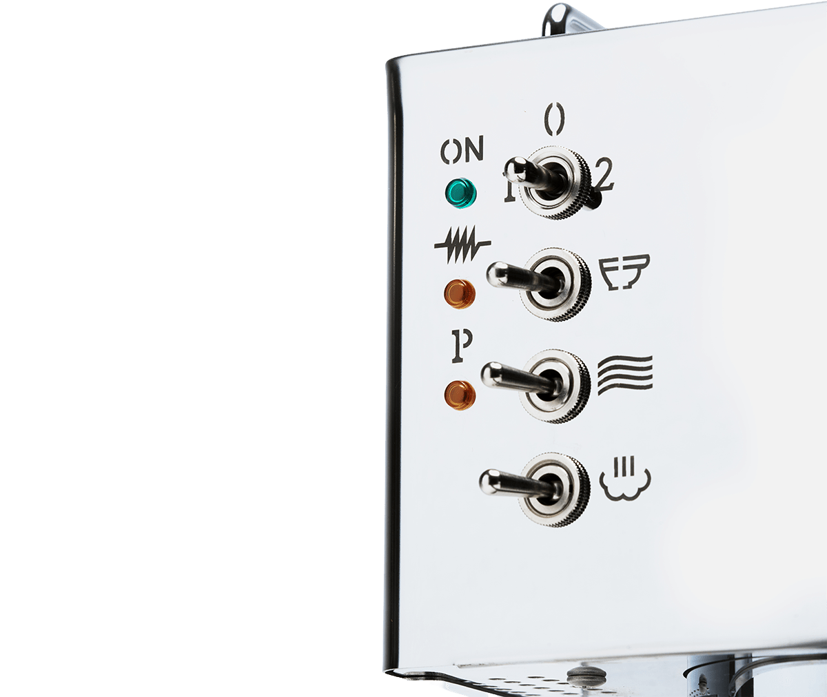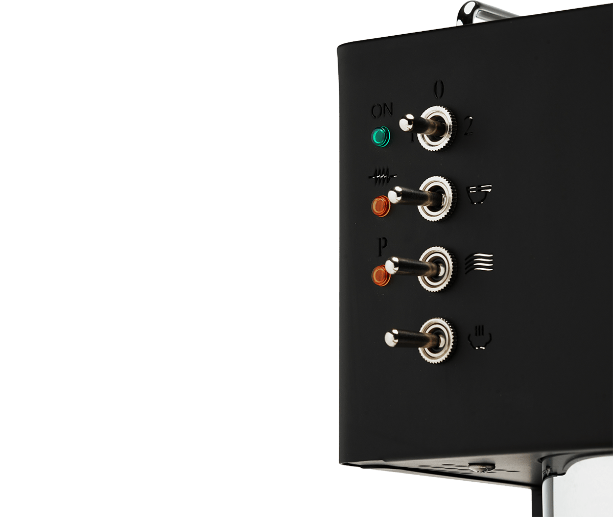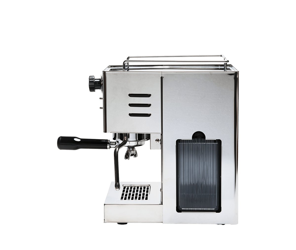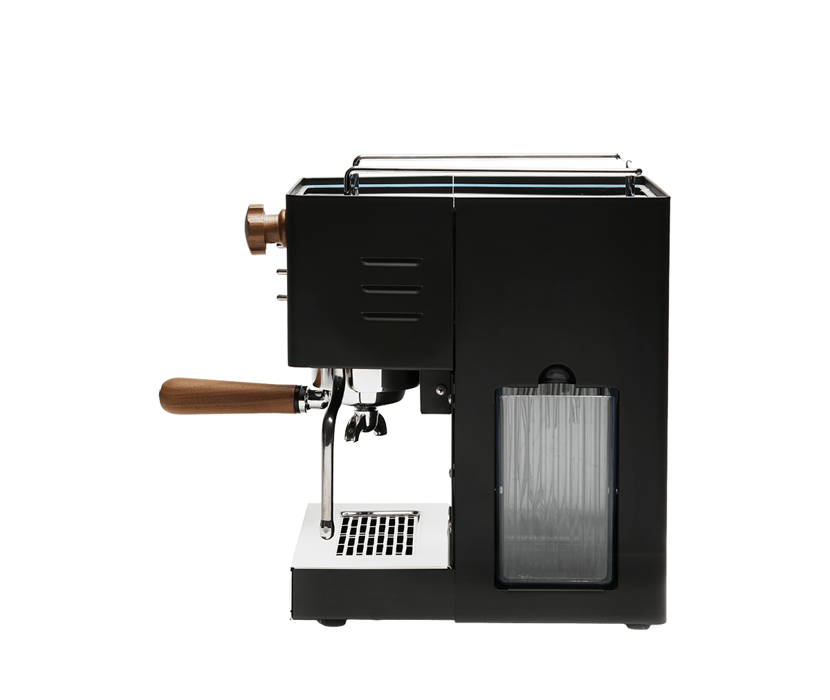 Rám a vnější komponenty jsou vyrobeny z nerezové oceli. Přístroj je také k dispozici v matně černé verzi s parním knoflíkem a portafiltrem ze dřeva—ideální pro ty, kteří mají rádi moderní design.