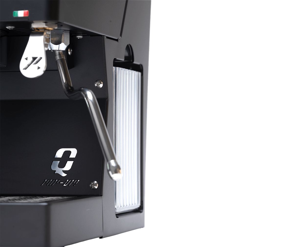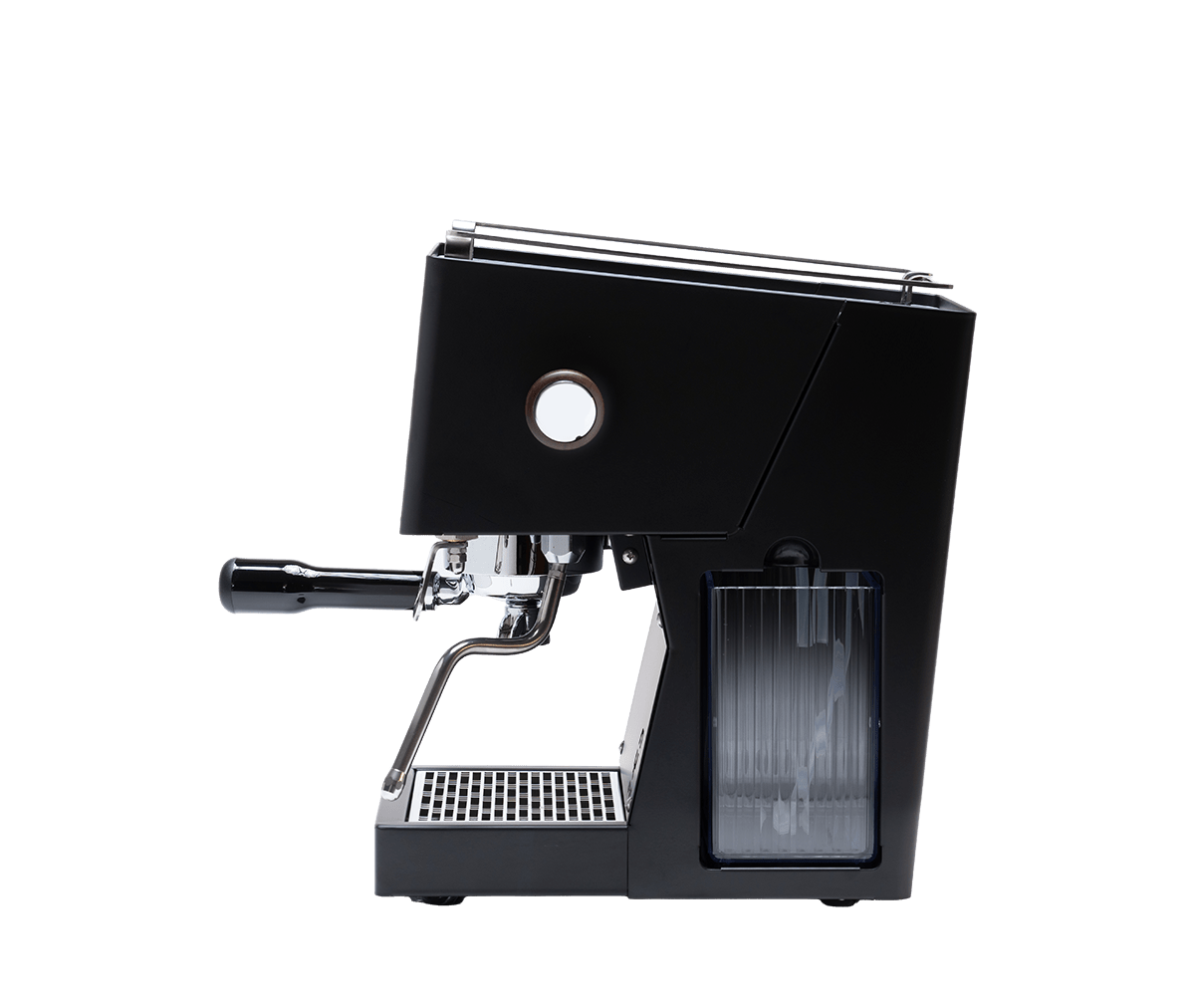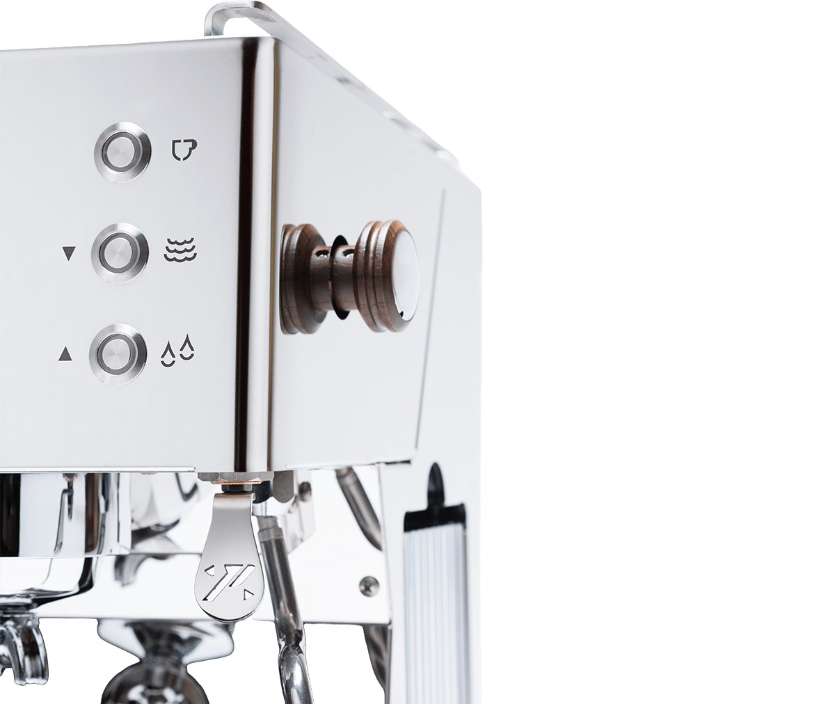 Stroj je k dispozici v nerezové oceli nebo matné černé barvě, obě varianty s dřevěnými detaily na páčce pary a portafiltru. Kruhová skupina zajišťuje konzistentní teplotu a spolehlivou kvalitu zpracování.
