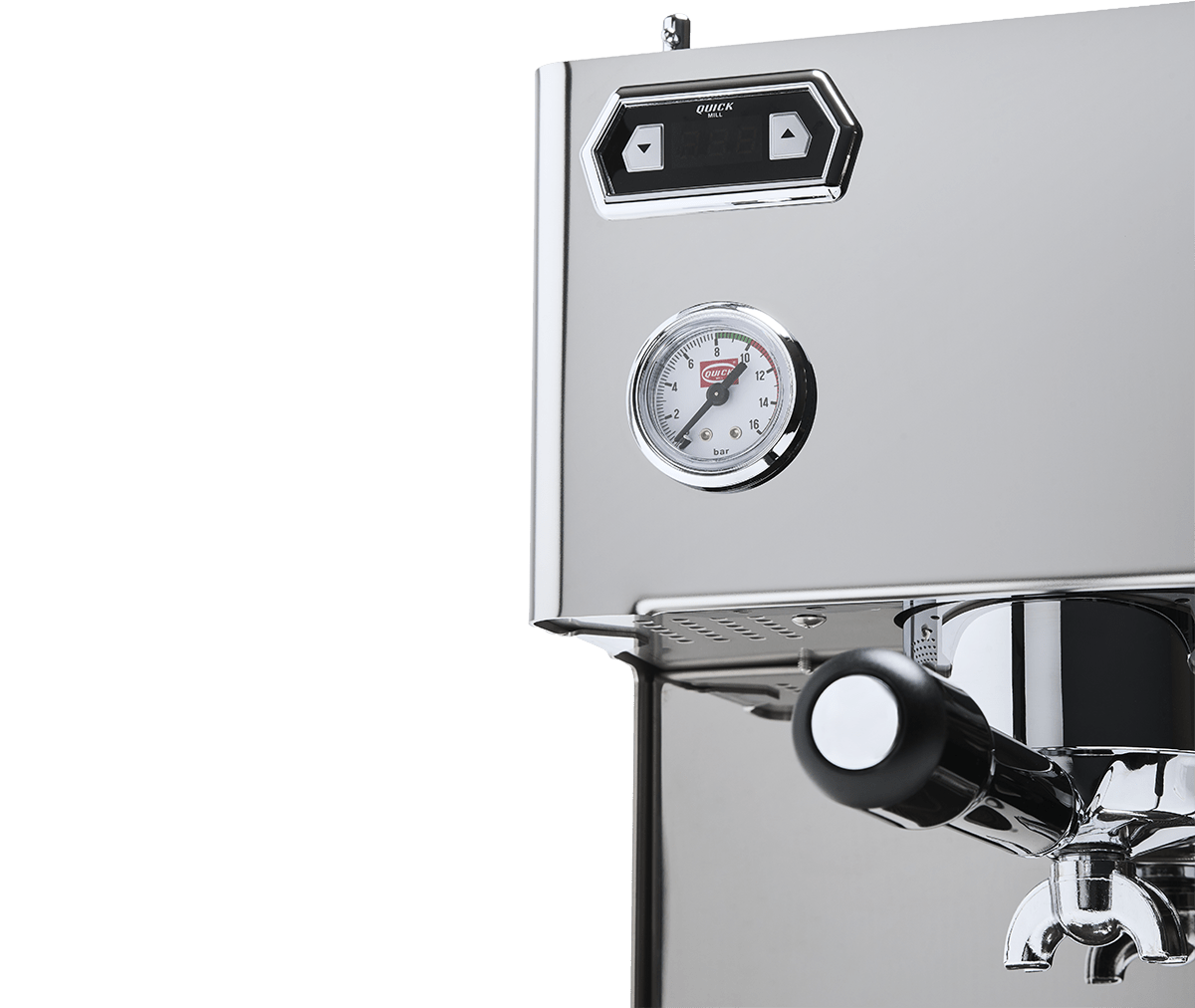 Manometr (0–16 bar) přesně ukazuje tlak, při kterém čerpadlo pracuje, což vám pomáhá optimalizovat mletí, dávkování a tampování pro perfektní shot.
